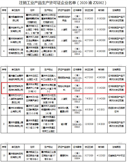 其中,重庆阿丽斯科关西涂料有限公司因证书到期且产品不再列为发证范围,工业产品生产许可证予以注销。