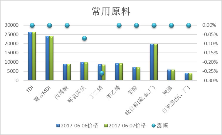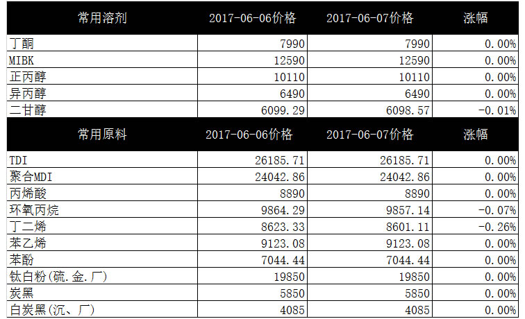 2017年6月7日涂料常用溶剂二甘醇出现跌幅(-0.01%),常用原料方面环氧丙烷出现跌幅(-0.07%)丁二烯出现跌幅(0.26%)其他暂无变化。涂料界商情研究社将持续对常用溶剂和原料进行行情监测报告。