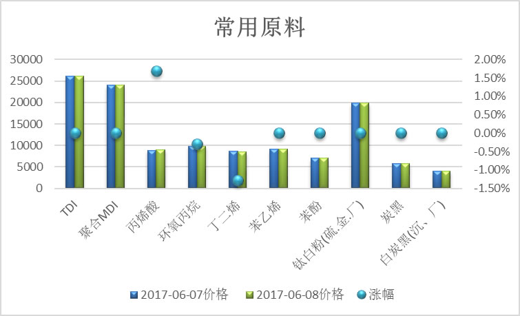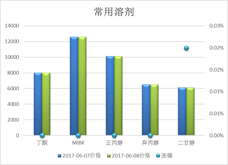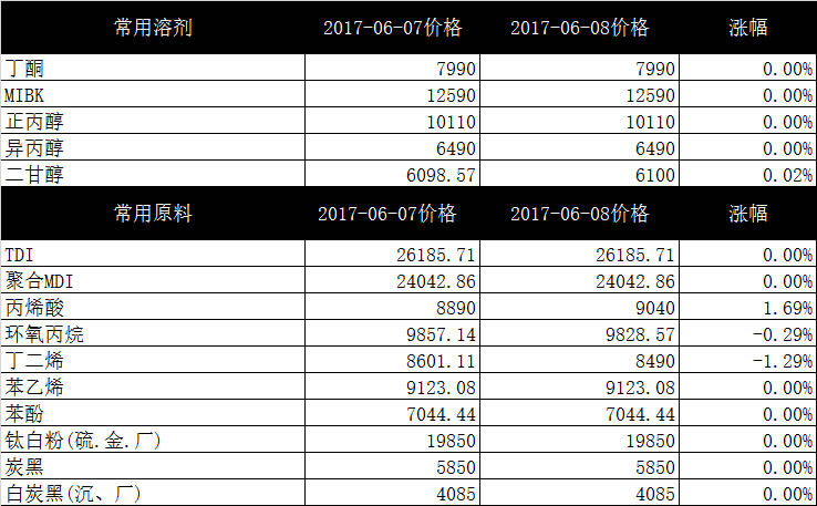 2017年6月8日涂料常用溶剂二甘醇出现跌幅(-0.02%),常用原料方面丙烯酸出现价格上涨趋势涨幅(1.69%)环氧丙烷较昨日价格继续出现跌幅(-0.29%)丁二烯较昨日继续出现继续跌幅(-1.29%)。 涂料界商情研究社将持续对常用溶剂和原料进行行情监测报告。