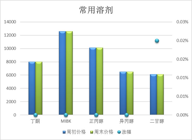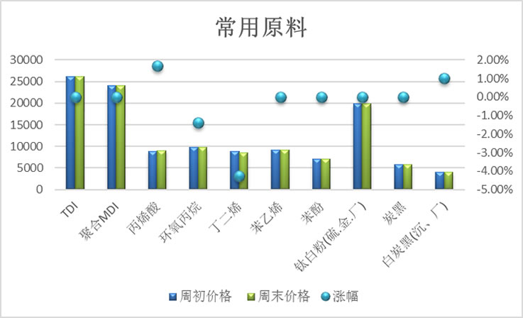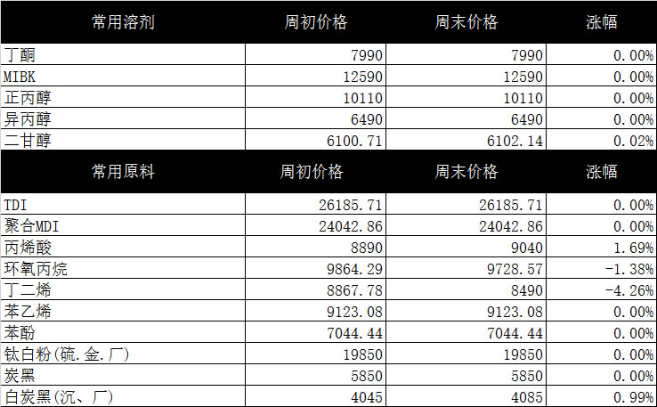 2017年第23周(6.5-6.9)涂料常用溶剂和原材料价格 ,常用溶剂二甘醇涨幅0.02%,常用原料丙烯酸涨幅1.69%,白炭黑涨幅0.99%,环氧丙烷跌幅-1.38%,丁二烯跌幅-4.26%