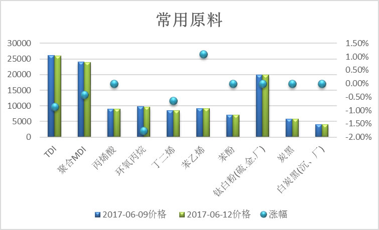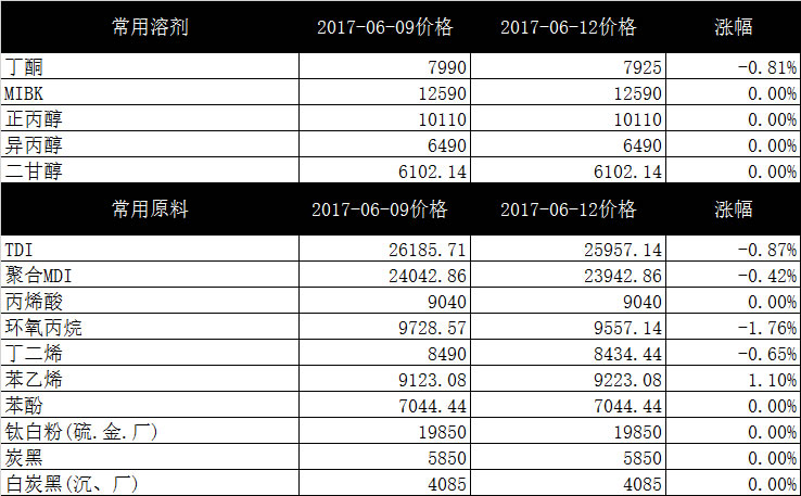 2017年6月8日涂料常用溶剂丁酮出现跌幅(-0.81%),常用原料方面除苯乙烯较上周五价格出现价格涨幅(1.10%)外,较上周五价格TDI出现价格跌幅(-0.87%),聚合MDI跌幅(-0.42%)环氧丙烷跌幅(-1.76%),丁二烯跌幅(-0.65%)。