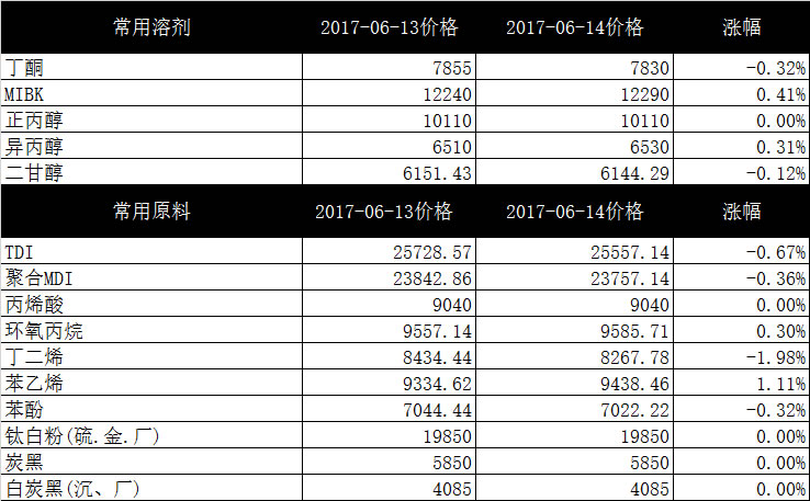 根据涂料界商情研究社对06月13-14日价格的观察,近两日来出现涨幅的涂料常用溶剂MIBK、异丙醇; 出现跌幅的有:丁酮、二甘醇;在常用原料方面出现涨幅有:环氧丙烷,苯乙烯,出现跌幅的有:TDI,聚合MDI,丁二烯,苯酚;涂料界商情研究社将持续对常用溶剂和原料进行行情监测分析报告