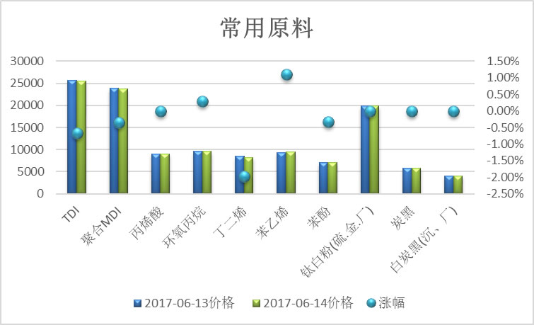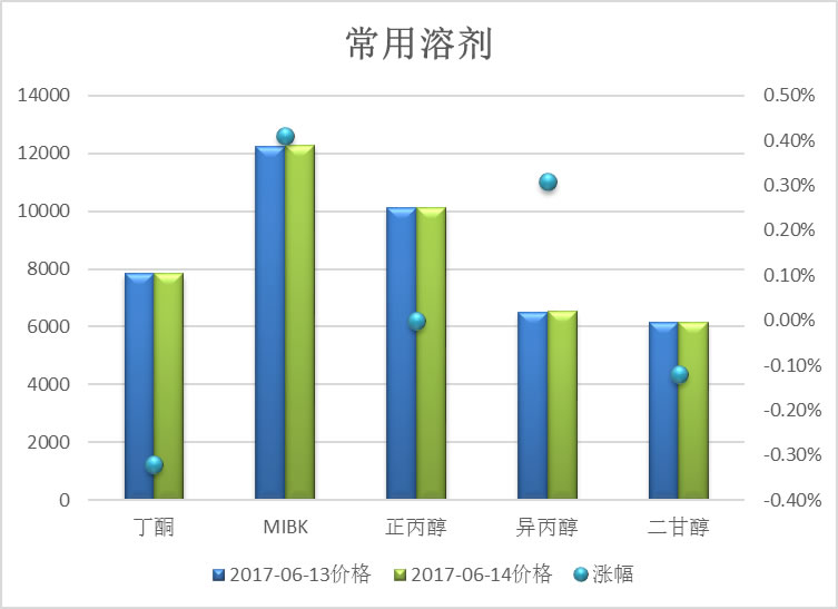 根据涂料界商情研究社对2017-06-13价格 和2017-06-14价格的观察,近两日来涂料常用溶剂:MIBK涨幅(0.41%)异丙醇涨幅(0.31%)丁酮跌幅(-0.32%)二甘醇跌幅(0.12%);在常用原料方面:环氧丙烷涨幅(0.30%),苯乙烯涨幅(1.11%),TDI跌幅(-0.67%),聚合MDI跌幅(-0.36%),丁二烯跌幅(-1.98%),苯酚跌幅(-0.32%);涂料界商情研究社将持续对常用溶剂和原料进行行情监测分析报告。