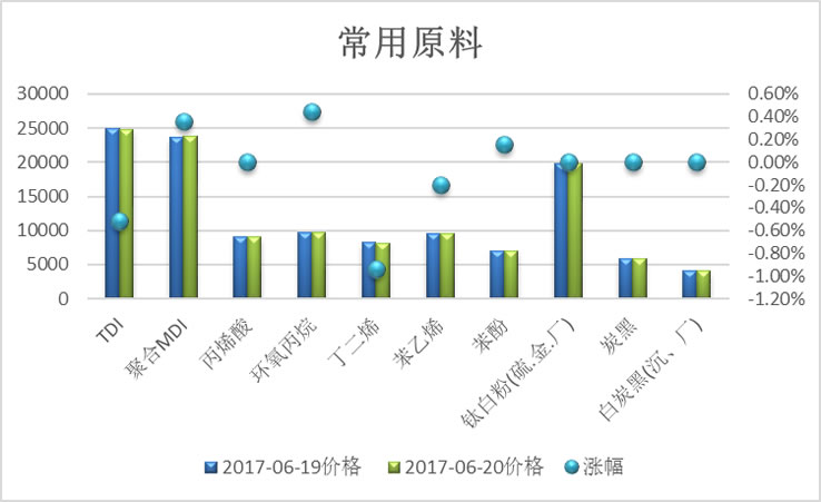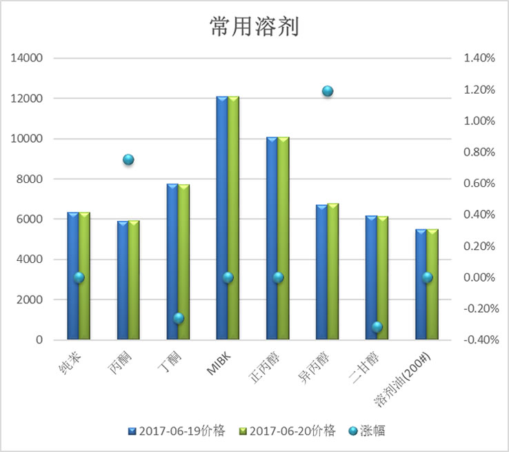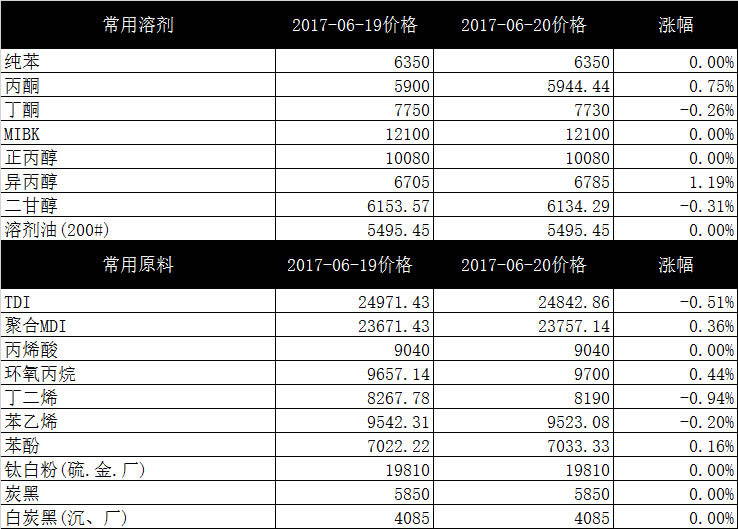 涂料界商情研究社对比2017-06-19和2017-06-20市场平均价格,涂料常用溶剂价格出现涨幅有2种商品分别为:丙酮继续昨日继续行情上涨(涨幅0.75%)、异丙醇上涨(涨幅1.19%),出现跌幅的有2种商品分别为:丁酮继续昨日行情下跌(跌幅-0.26%)、二甘醇续昨日行情下跌(跌幅-0.31%);在涂料常用原料方面价格出现涨幅的有3种商品分别为:聚合MDI停止昨日下跌行情,出现上涨(涨幅0.36%);环氧丙烷继续昨日上涨行情(涨幅0.44%)、苯酚上涨(涨幅0.16%);出现价格跌幅的有3种商品分别为:TDI继续下跌(跌幅-0.51%)、丁二烯下跌(跌幅-0.94%)、苯乙烯(跌幅-0.20%)。