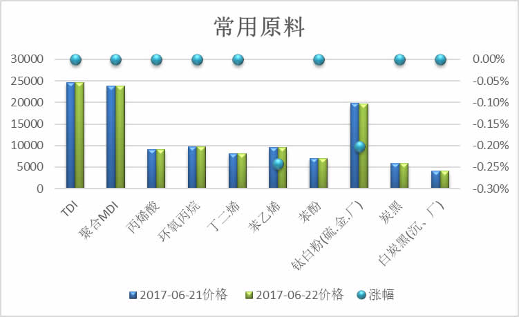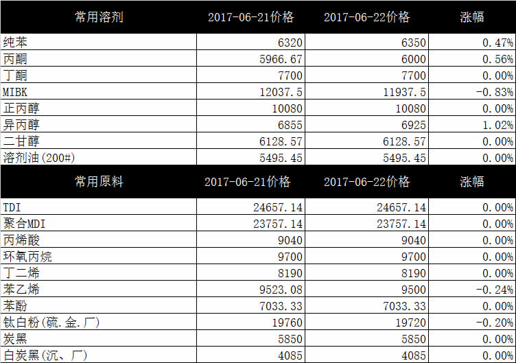 涂料界商情研究社对比2017-06-21和2017-06-22市场平均价格,涂料常用溶剂价格出现涨幅有3种商品分别为:纯苯出现上涨涨幅(0.47%),丙酮继续昨日继续行情上涨(涨幅0.56%)、异丙醇继续昨日行情上涨(涨幅1.02%),出现跌幅的有1种商品分别为:MIBK价格继续昨日价格下跌(-0.83%);在涂料常用原料方面价格暂无出现涨幅商品;出现价格跌幅的有2种商品分别为:苯乙烯继续下跌(跌幅-0.24%)、钛白粉继续昨日下跌态势(跌幅-0.20%)。