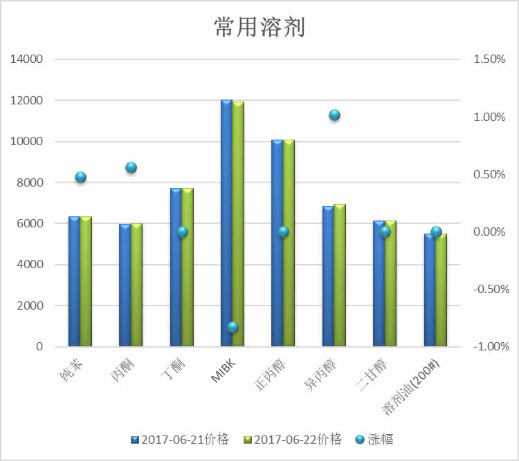 涂料界商情研究社对比2017-06-21和2017-06-22市场平均价格,涂料常用溶剂价格出现涨幅有3种商品,出现跌幅的有1种商品;在涂料常用原料方面价格暂无出现涨幅商品;出现价格跌幅的有2种商品。