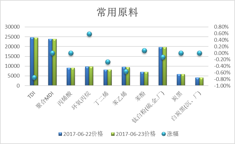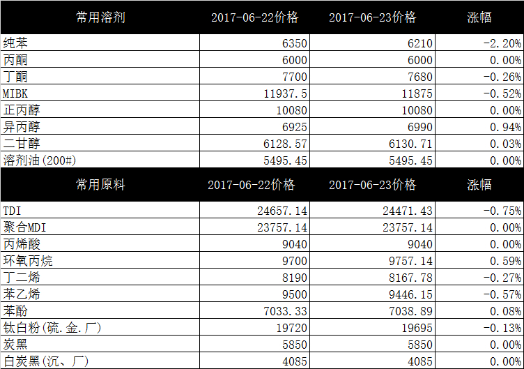 涂料界商情研究社对比2017-06-22和2017-06-23市场平均价格,涂料常用溶剂价格出现涨幅有2种产品分别为:二甘醇出现上涨涨幅(0.03%),异丙醇行情上涨放缓(涨幅0.94%),出现跌幅的有3种商品分别为:纯苯出现价格下跌(跌幅-2.20%),丁酮价格小幅度下跌(跌幅-0.26%),MIBK价格价格继续下跌(跌幅-0.52%);在涂料常用原料方面价格出现2种产品价格上涨,环氧丙烷价格上涨(涨幅0.59%),苯酚价格上涨(涨幅0.08%);出现价格跌幅的有4种产品分别为:TDI价格下跌(跌幅-0.75%),丁二烯价格下跌(跌幅-0.27%),苯乙烯继续下跌(跌幅-0.57%)、钛白粉继续昨日下跌态势(跌幅-0.13%)。