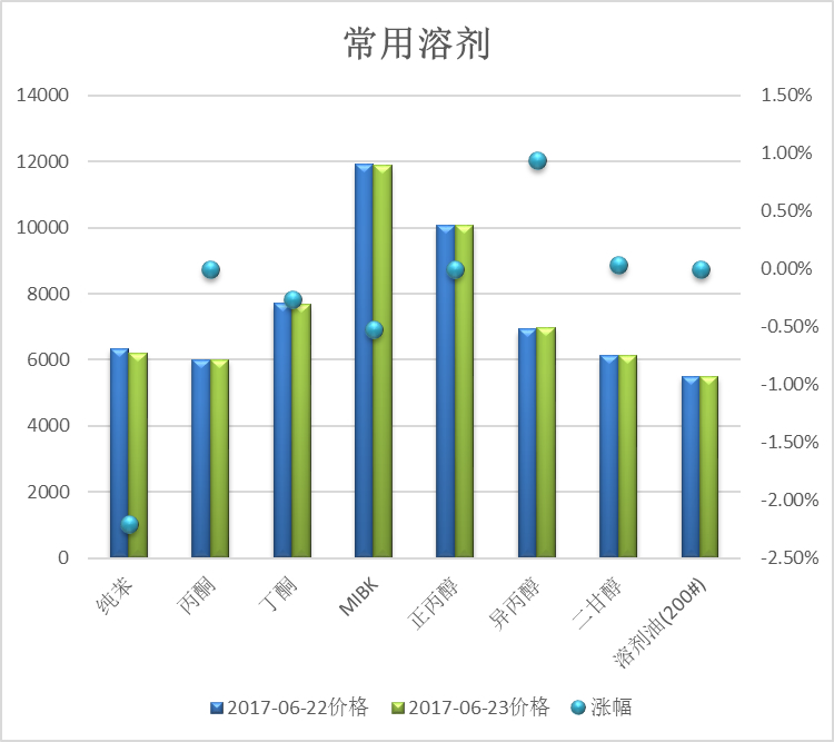 涂料界商情研究社对比2017-06-22和2017-06-23市场平均价格,涂料常用溶剂价格出现涨幅有2种商品,出现跌幅的有3种商品;在涂料常用原料方面出现涨幅有2种商品;出现价格跌幅的有4种商品。
