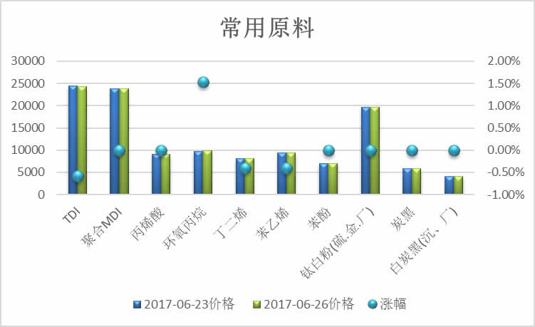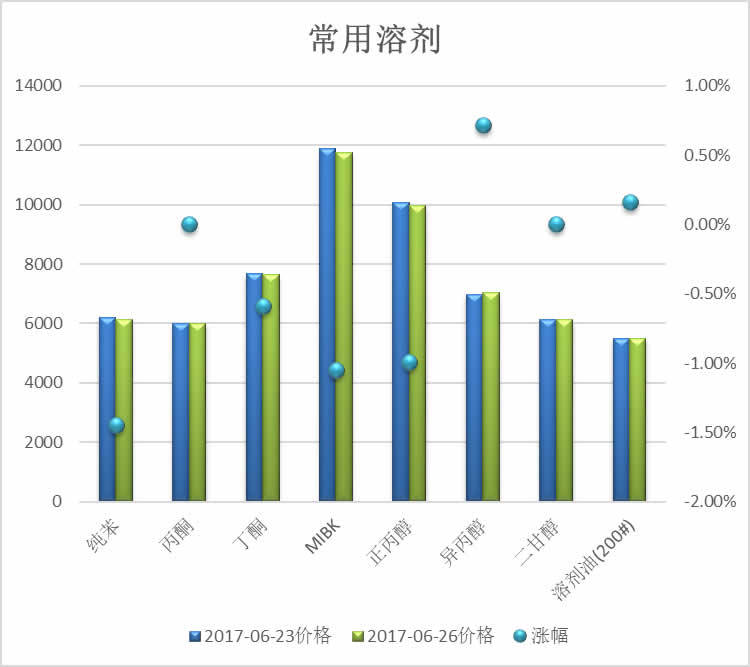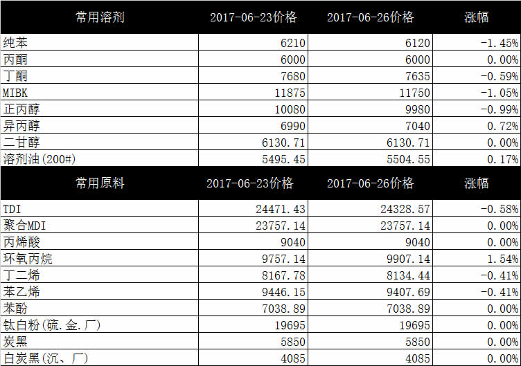 涂料界商情研究社对比2017-06-23和2017-06-26市场平均价格,涂料常用溶剂价格出现涨幅有2种商品,出现跌幅的有4种商品;在涂料常用原料方面出现涨幅有1种商品;出现价格跌幅的有3种商品。