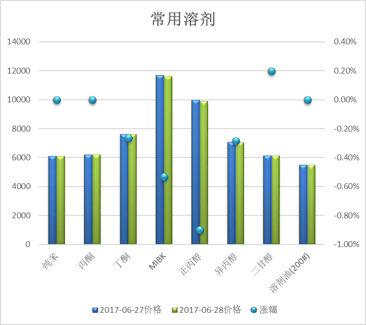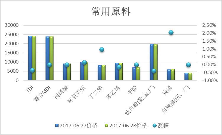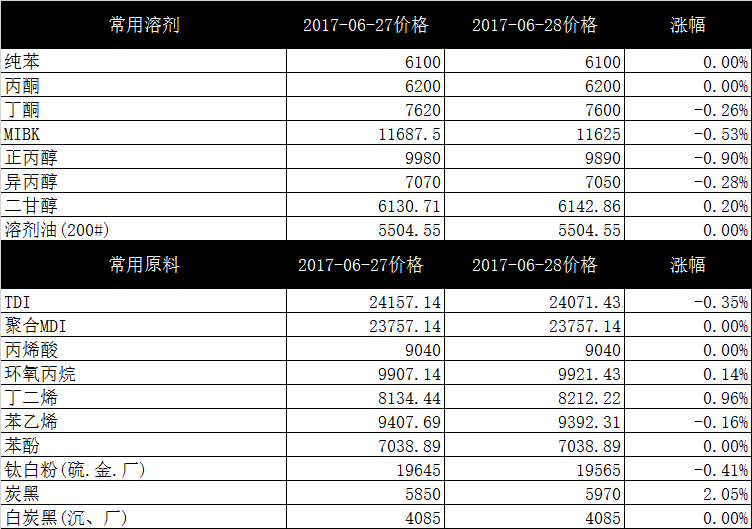 涂料界商情研究社对比2017-06-27和2017-06-28市场平均价格,涂料常用溶剂价格出现涨幅有1种产品分别为:二甘醇醇行情上涨(涨幅0.20%),出现跌幅的有4种商品分别为:丁酮价格小幅度下跌(跌幅-0.26%),MIBK价格价格持续下跌(跌幅-0.53%),正丙醇价格下跌(跌幅-0.90%)、异丙醇价格下跌(跌幅-0.33%);在涂料常用原料方面价格出现3种产品价格上涨:环氧丙烷价格上涨(涨幅0.14%)、丁二烯价格上涨(涨幅0.96%)、炭黑价格上涨(涨幅2.05%);出现价格跌幅的有3种产品分别为:TDI价格持续下跌(跌幅-0.35%),苯乙烯加莪下跌(跌幅-0.16%),钛白粉继续价格下跌(跌幅-0.41%)。